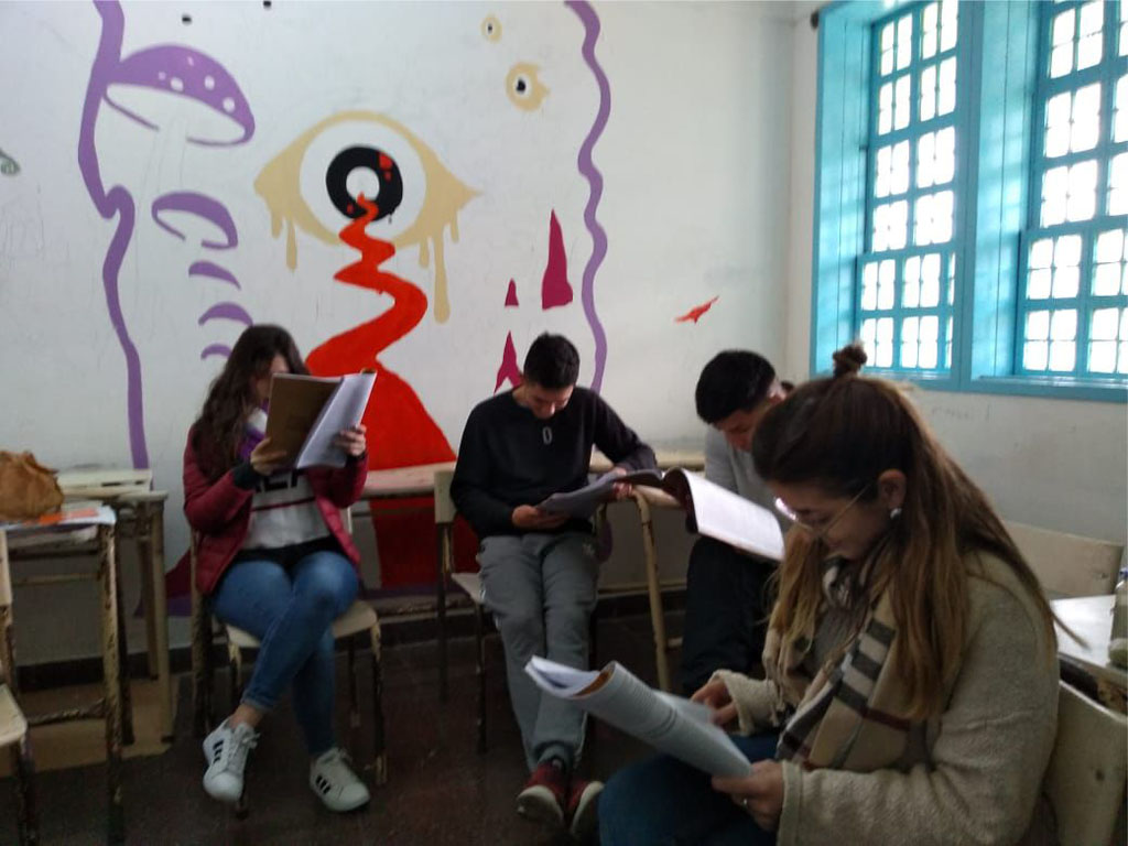 “Es difícil escribir cuando la hoja está en blanco”, dijo uno de los chicos en el primer encuentro. Pasando, habitando, cada encuentro siguiente, cada uno de ellos fue encontrando la manera de poner en palabras, de abarcar a través de ellas algo de lo que sentían, de lo que vivieron o lo que pensaban. Algunos motivados a través de la música, otros escribiendo poemas, otros haciendo un relato de su historia vivida, por venir o deseada, otros firmes con su cuerpo frente a esa hoja en blanco que los interpelaba y luchaban por escribir alguna palabra. En cada una de esas luchas personales, que por momentos se volvían colectivas, fue apareciendo lo singular de cada uno, en sus escritos. La hoja en blanco -y la incertidumbre que produjo la libertad de la “no consigna”- fue dando lugar a un espacio “otro”, un lugar diferente: momentos de silencio, de bullicio, de risas, de idas y venidas reflejado en las expresiones de los participantes. También, momentos de charla, de intercambio, entre participantes y extensionistas. Mates como recurso, insumo e instrumento infaltable y coagulante. Algo rico para comer. Algún que otro cigarrillo.